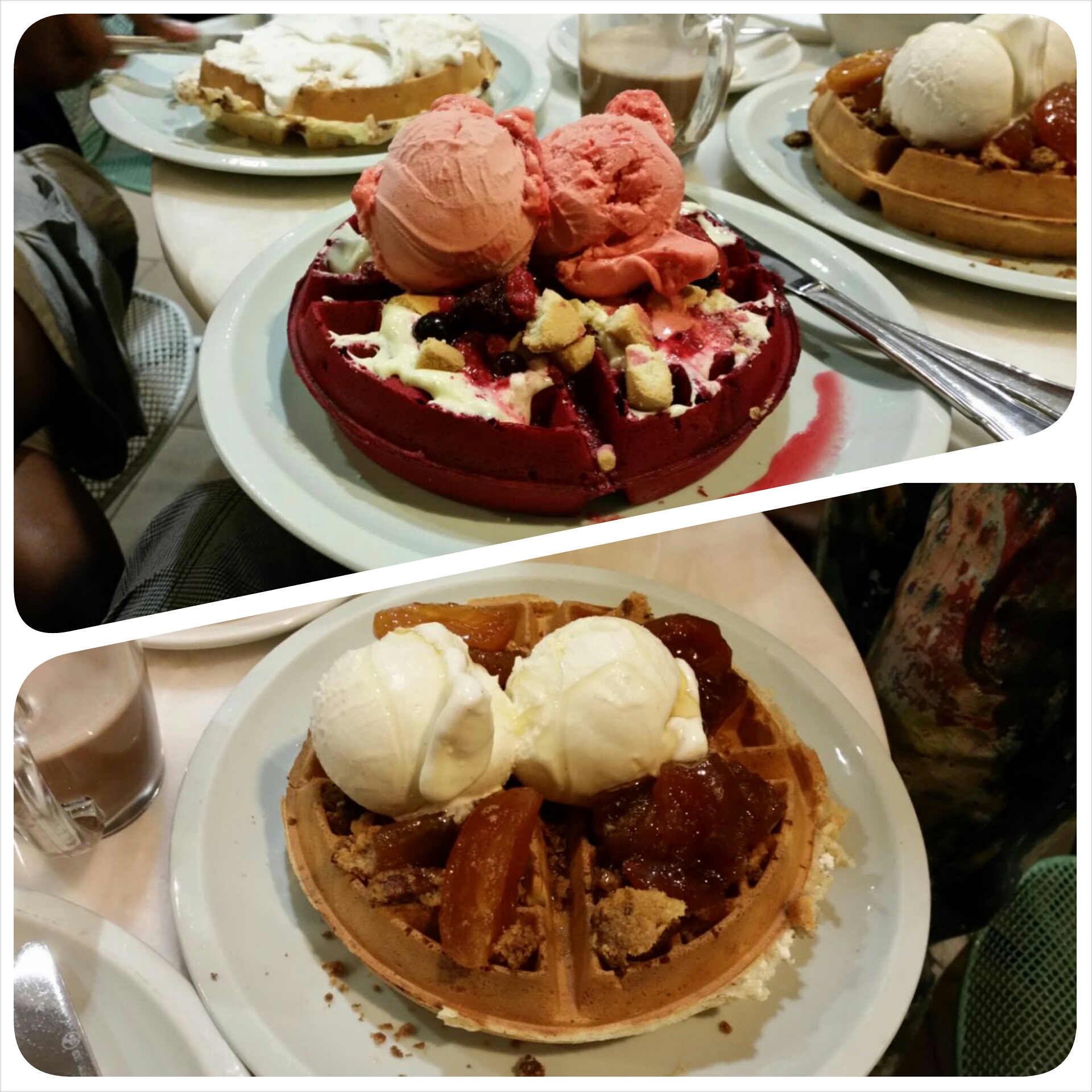 - This place is dessert heaven…it has an array of sweet treats, frozen yogurt, shakes, waffles and ice-cream. I don’t usually like taking pictures of food but I could not resist when I saw the size of our waffles.