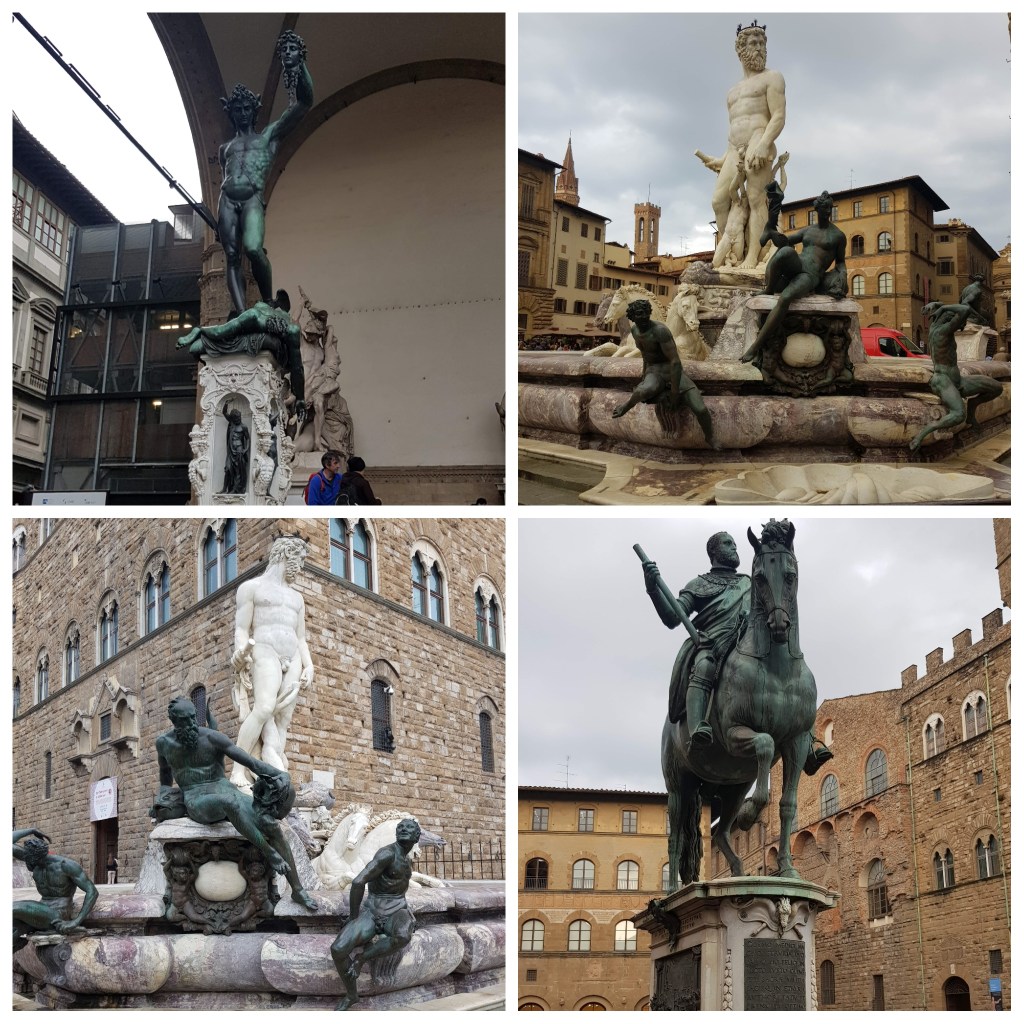 The Piazza della Signoria is the heart of the city for Florentines. It has been the political center of Florence since the 14th century, a site for political rallies, festivals, and ceremonial events. You’ll find several iconic Florence tourist attractions: Palazzo Vecchio (Florence townhall), the Neptune Fountain, the Uffizi Gallery (a prominent art museum), the Loggia dei Lanzi (corner building with wide arches), and copies of statues by Michelangelo and Donatello.